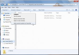 If you have folders that you would like to access or save to regularly, then using favourites in Windows Explorer could be a great solution. In Windows 7, Explorer has a left sidebar that displays links to your drives, libraries and favourites.